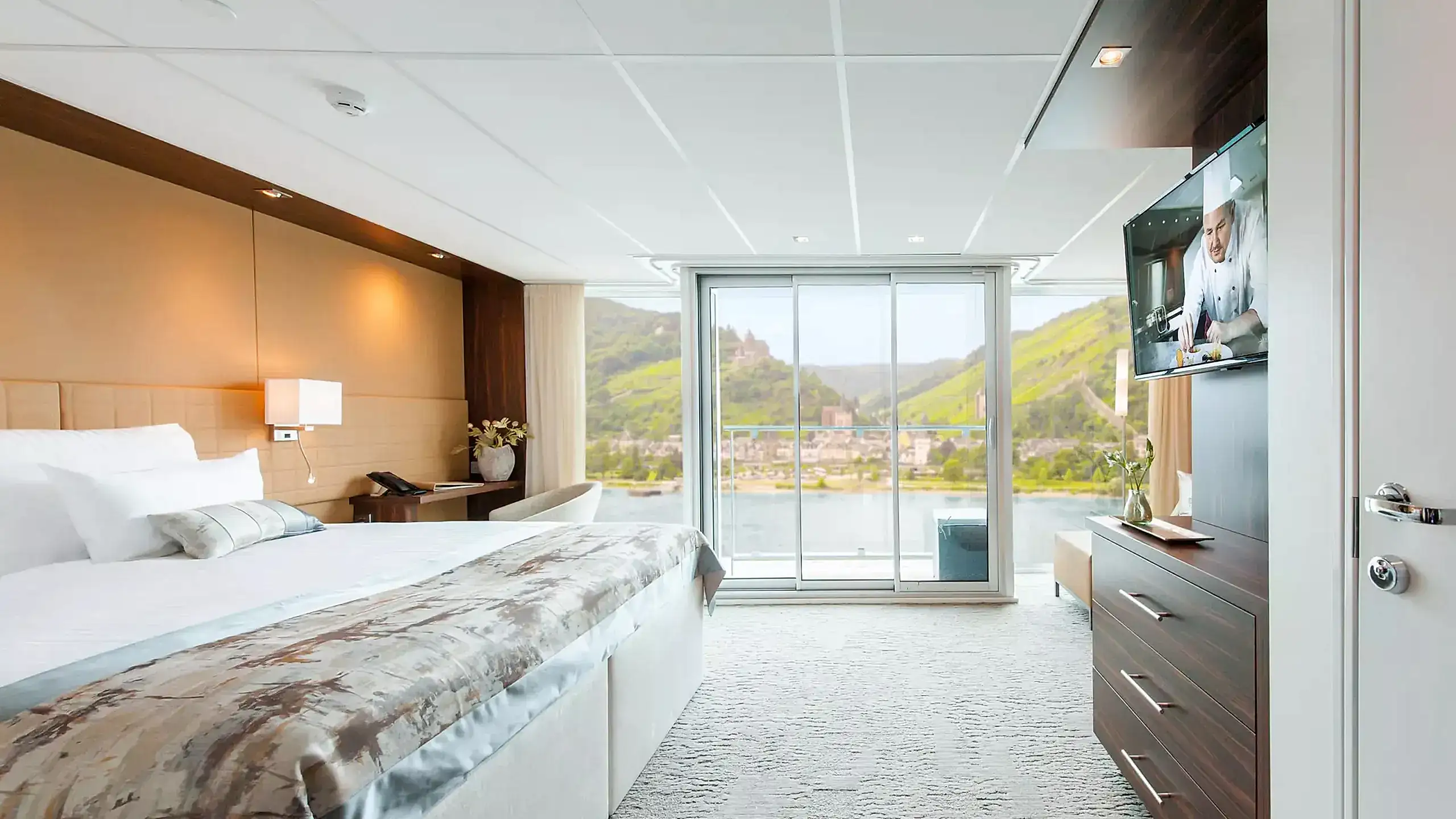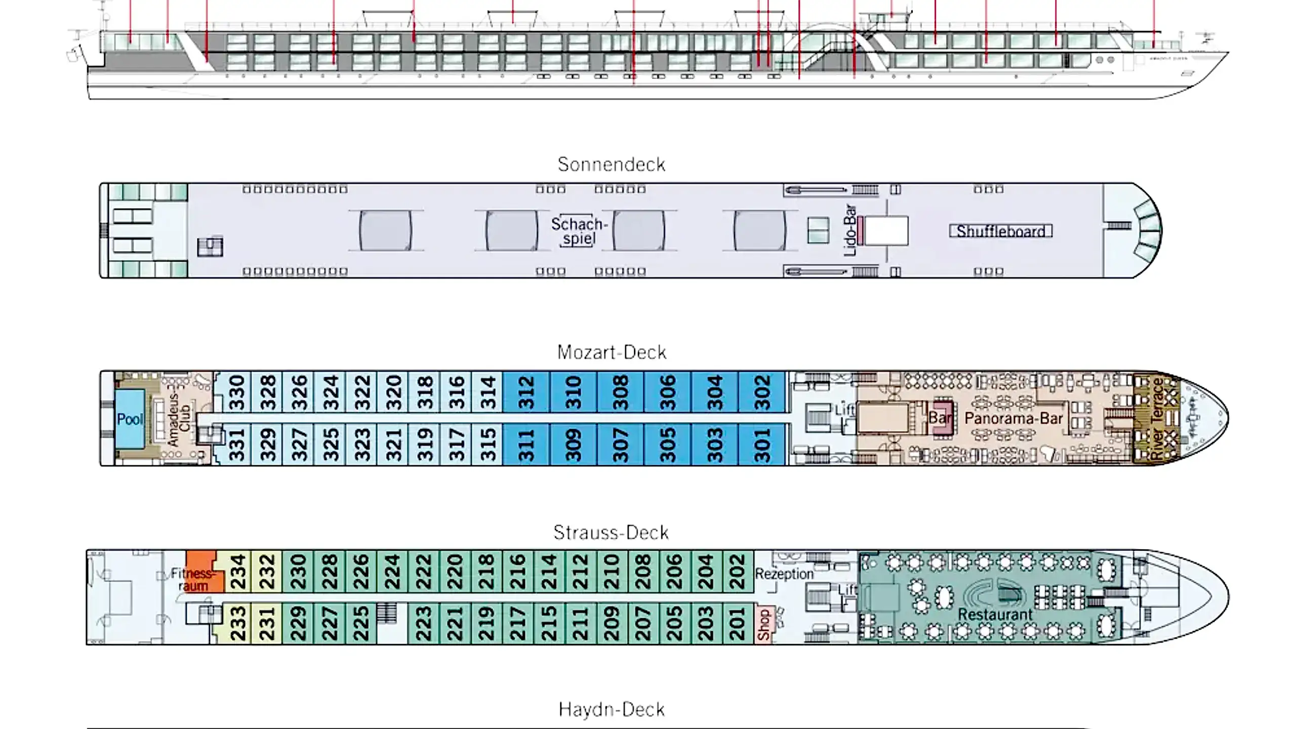 Unser Flussschiff: MS AMADEUS Queen ***** Willkommen an Bord dieses Mitglieds der AMADEUS-Flussschiff-Flotte. Die AMADEUS Queen (Baujahr 2018) ist eines der Premium-Schiffe der Amadeus-Flotte. 69 Kabinen und 12 Suiten, verteilt auf drei Kabinendecks, sind das komfortable Zuhause auf Europas Flüssen. Von Bug bis Heck bietet die Amadeus Queen lichtdurchflutete Räume, gemütliche Ecken und wunderschöne Außenbereiche. Die Kabinen auf dem Haydndeck (ca. 16 m²) verfügen über ein großzügiges Bad, ein großes Außenfenster (nicht zu öffnen), eine individuell zu regulierende Klimaanlage, einen TV-Flatscreen, Haartrockner, Telefon und Safe. Des Weiteren verfügt die Kabine über einen begehbaren Kleiderschrank. Die Kabinen auf dem Strauss- und Mozartdeck (ca. 17,5 m²) verfügen bei gleicher Ausstattung über eine absenkbare Panorama-Fensterfront und eine Minibar. Besonders komfortabel präsentieren sich die 12 Suiten (ca. 26,4 m²) mit begehbarem Außenbalkon. Das luxuriöse Badezimmer ist ein weiteres Highlight an Bord und eine wertvolle Ergänzung zu den ansonsten gleich komfortabel eingerichteten Kabinen. Zu den Mahlzeiten und in den Bars verwöhnt Sie die AMADEUS mit saisonalen und regionalen Spezialitäten sowie einem aufmerksamen Service. Genießen Sie die Tage an Bord der AMADEUS Queen!